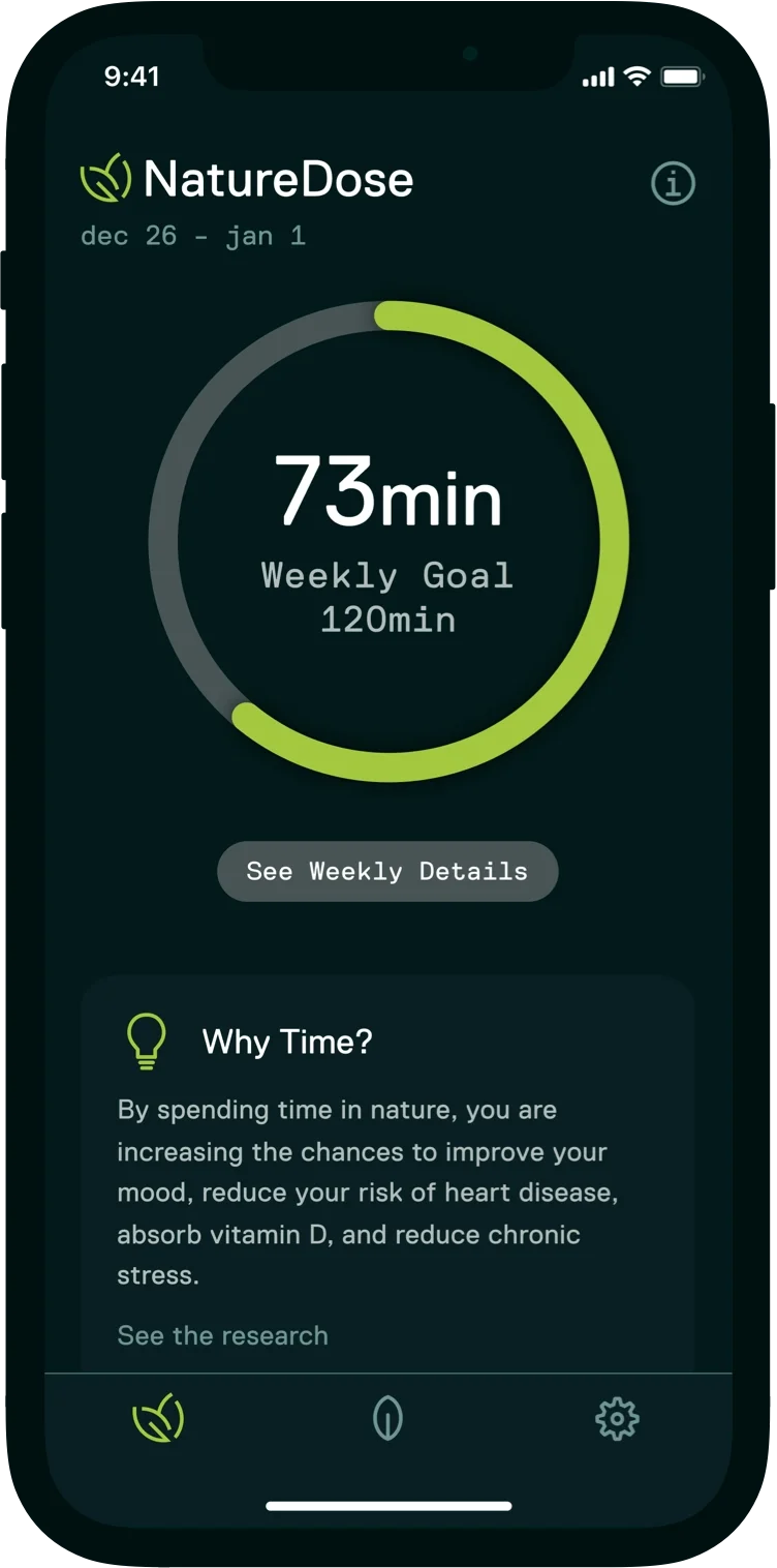 NatureDose app provides a personalized nature prescription tracker that monitors aggregate time inside, outside, and exposed to nature to help users obtain ecotherapy benefits.