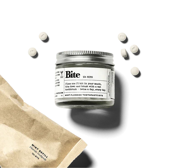 Bite makes zero-waste toothpaste tablets with clean ingredients, refillable glass containers, plastic-free refills, and a cruelty-free approach. Saves over 75,000lbs. of plastic waste a year.